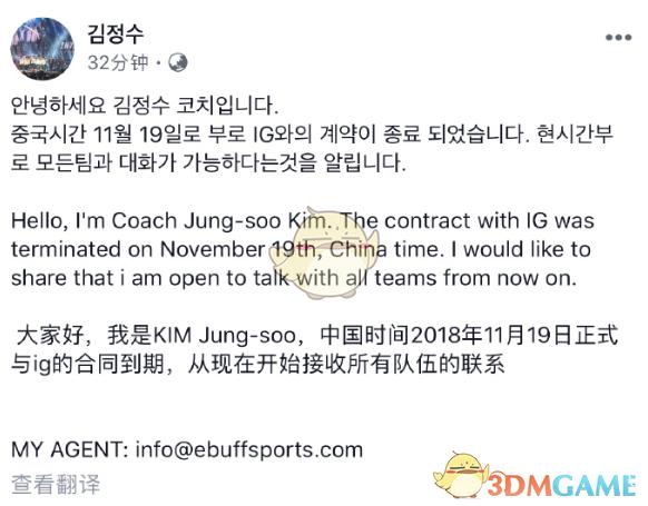 据iG战队主教练金晶洙脸书消息,目前金教练与iG战队的合约到期,已成为自由人教练,同时金教练也有意向接受所有所有队伍的联系。