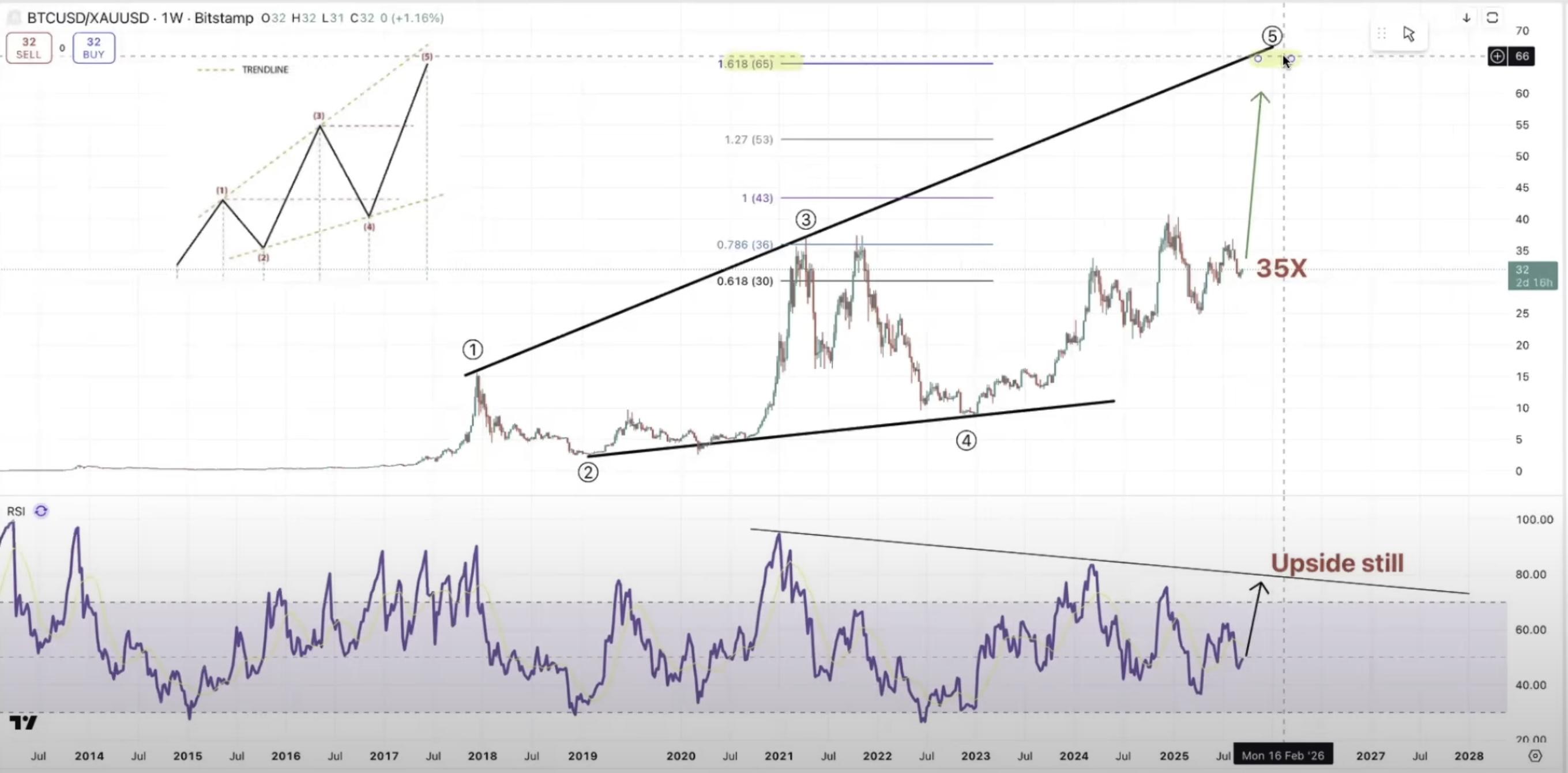 根据图表,这位经济学家认为,BTC/黄金比率短期内可能上涨约 35 倍。目前 BTC/黄金比率为 30。