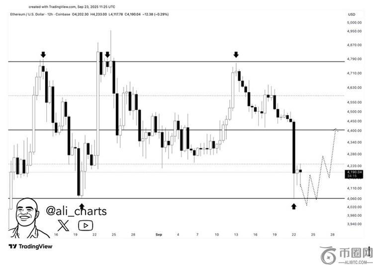 链上分析师 Ali Martinez已识别4,000 美元是关键支撑位。数据显示,该区域附近买盘活跃,历史上通常也是反弹发生的点位。如果买家守住该支撑位,以太坊可能会重新测试 4,400 美元,这一阻力位此前曾阻止过反弹。