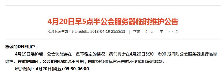 4月19日维护后,公会功能存在一些不稳定的情况,我们将会在4月20日5:30 - 6:00 期间对公会服务器进行临时维护。在维护期间,公会相关功能均不可用,由此给各位玩家带来的不便我们深表歉意。