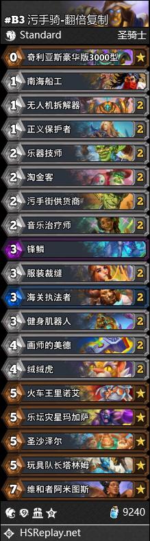 污手骑也不聊了,这模板卡组,有人带了给海盗加风怒偷鸡用,可以用那张换掉一张针对卡。起手找牌:绒绒虎,画师的美德,无人机拆解器,污手街供货商,乐器技师,淘金客。