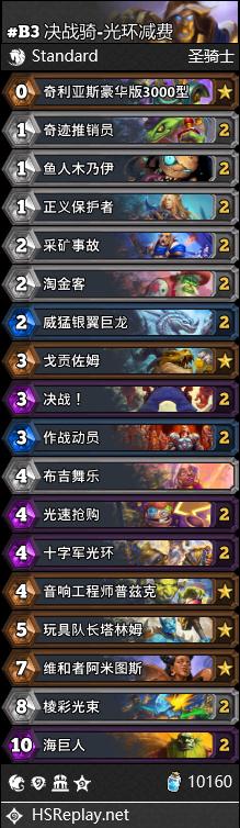 决战骑的奇利亚斯被削弱后明显就不行了,但是由于其能非常有效的针对自残术龙牧等去打德鲁伊的卡组,本身打德也不错,结果还能赖在环境中。起手找牌:戈贡佐姆,采矿事故,奇迹推销员,威猛银翼巨龙,布吉舞乐,淘金客。