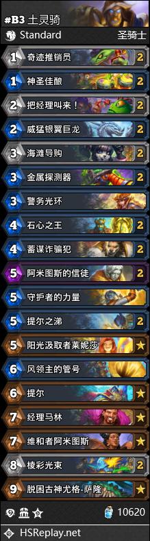 土灵骑是最近一周比较令人意外的卡组,它可以有效的使用盗贼的双职业卡给土灵减费迅速的展开场面,虽然胜率不高,但有很多不怕输的拥趸。起手找牌:蓄谋诈骗犯,石心之王,把经理叫来,海滩导购,奇迹推销员,威猛银翼巨龙。