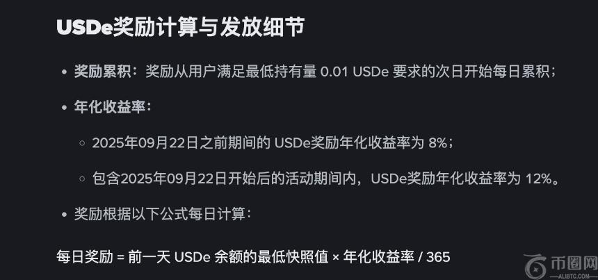 Binance 在继 USDC 补贴到期后,于 9 月 22 日启动了一项为期一个月的限时 USDe 奖励计划。在活动期间,符合条件的用户只需在币安账户中持有不少于 0.01 USDe 至少 24 小时,即可享受 12% 年化收益率的奖励,且激励额度不设上限。