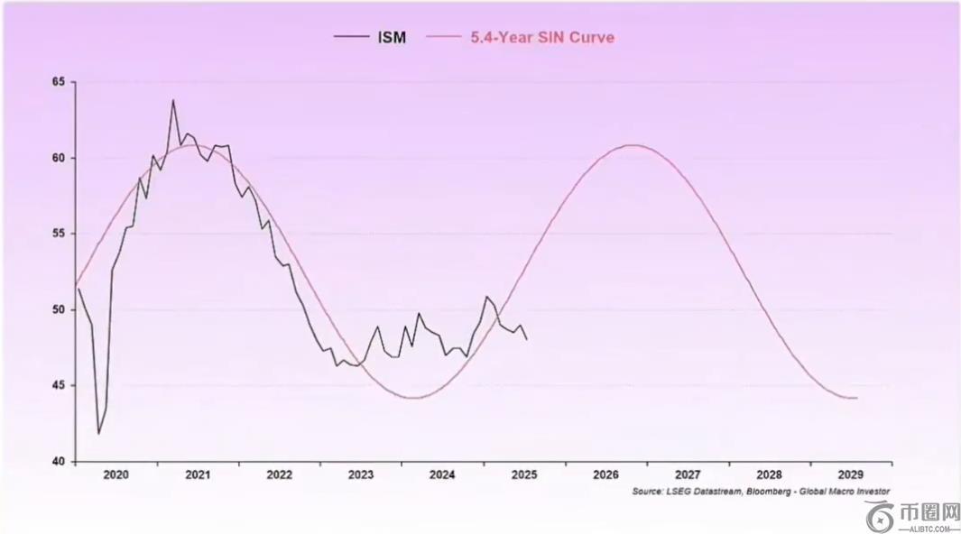 值得注意的是,正如之前的图表所示,比特币正密切关注ISM。因此,Pal还预计比特币将在2026年第二季度与ISM指标一同达到峰值。