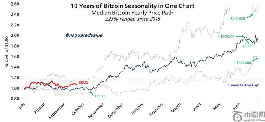 比特币10年的季节性表现在10月至6月最为强劲,预示着潜在的大幅上涨。
