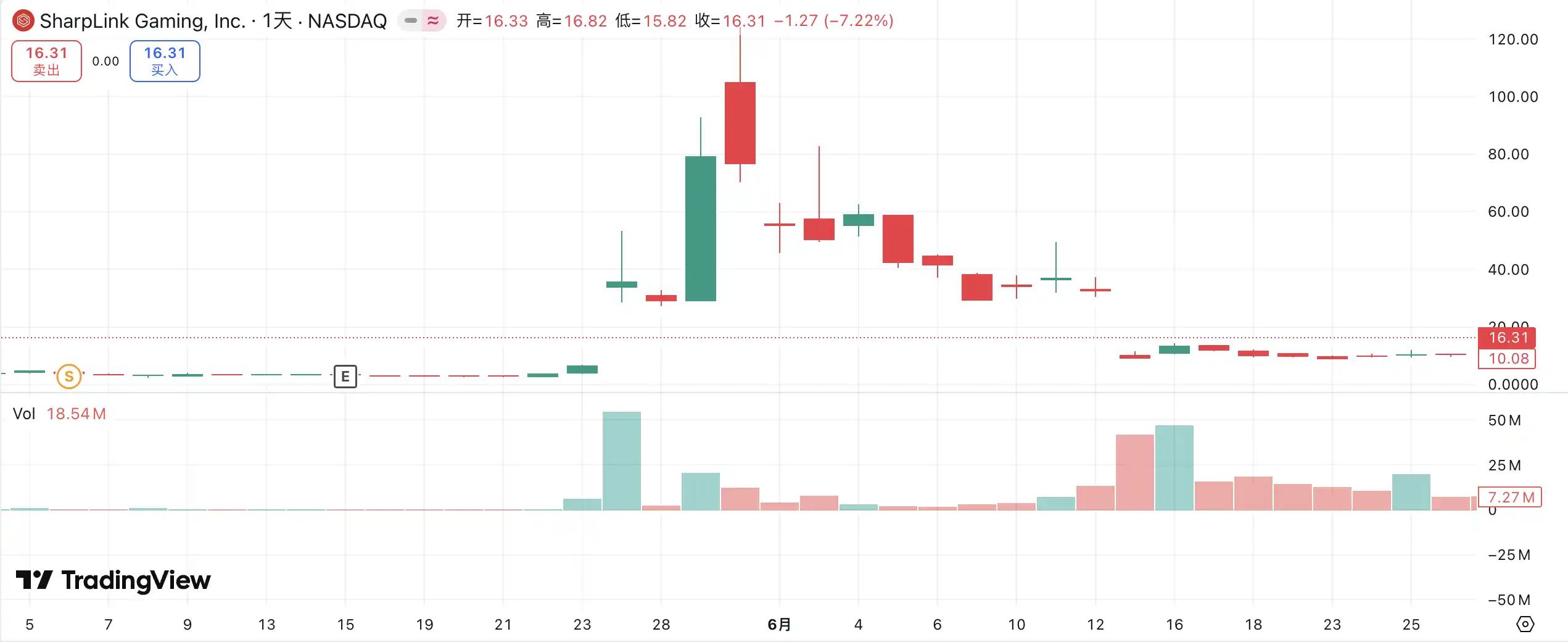 SharpLink Gaming 是这轮「加密财库热潮」中最早引发市场震动的案例之一。5 月 27 日,公司宣布将增持高达 4.25 亿美元的以太坊作为储备资产,消息公布当日,股价一度飙升至 52 美元。然而诡异的是,早在 5 月 22 日,该股的交易量就已显著放大,股价从 2.7 美元跃升至 7 美元,而彼时公司尚未发布公告,也未向 SEC 披露任何信息。