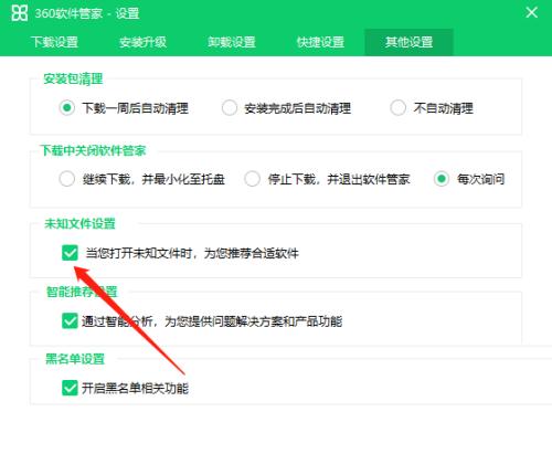 3、在打开的窗口界面中,点击上方中的"其他设置"选项,然后找到下方中的"当您打开未知文件时,为您推荐合适软件",将其小方框勾选上,最后点击确定即可。