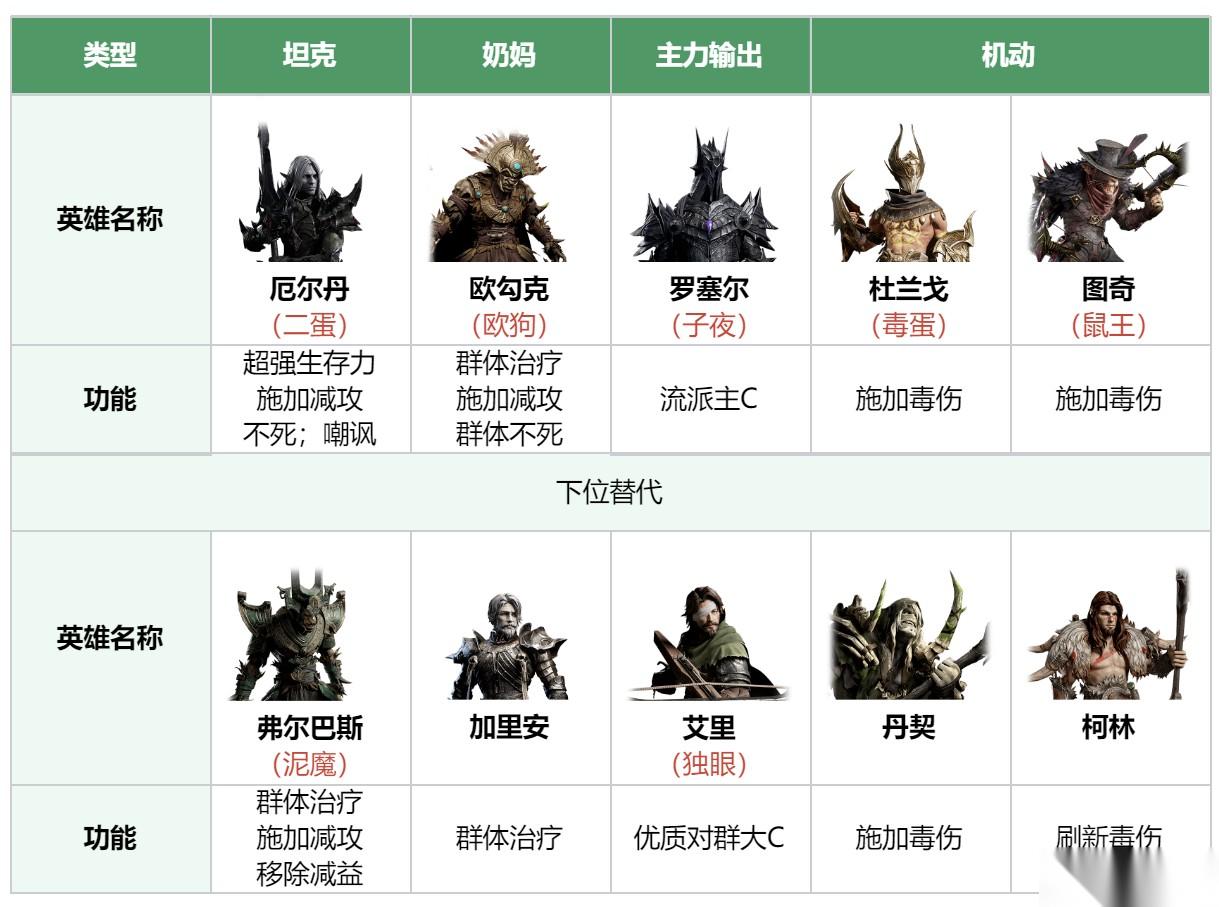 杜兰戈,副C,可以施加毒伤,他的特点是触发重击的时候技能有额外效果,挂毒效果很高。图奇也是不错的副C选角,毒系远程角色,大范围的毒伤,不仅是在一般推图关卡中很好用,爬塔也经常用到。特别是在竞技场来里,可以用来针对利用护盾减伤的队伍,图奇的激励效果有对护盾敌人的额外伤害。其他人选还有托维尔,有控制有减伤减疗,不错的承伤选择。欧勾克,有治疗、不死、减攻、移除减益,非常全面。蕾塔,减攻,驱散减益、推条、增长减益。