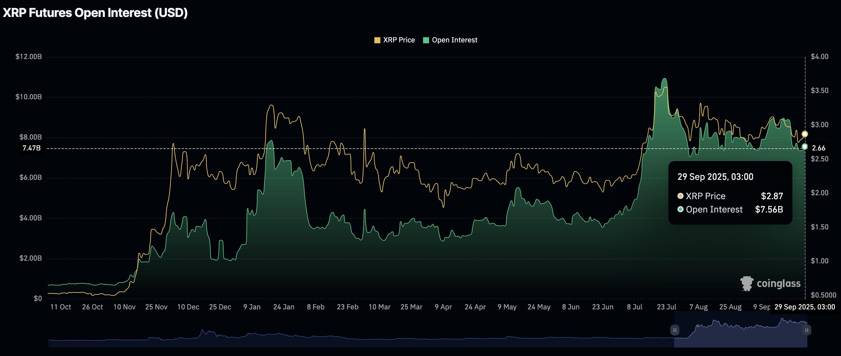 与此同时,自 7 月中旬以来,散户对 XRP 的兴趣一直相对低迷,标志着 XRP 从历史高点回落。CoinGlass 数据显示,期货未平仓合约(OI,指所有期货合约的名义价值)在 7 月 22 日创下 109.4 亿美元的历史高点后,截至周一撰写本文时平均为 75.6 亿美元。