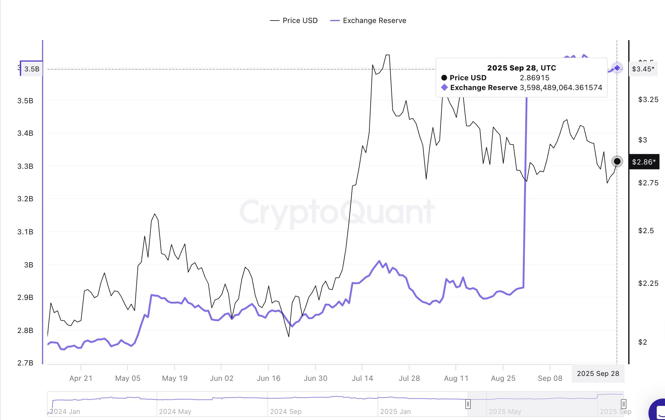 自9月初以来,XRP持有者已将大量XRP转入交易所,从而增加了储备。根据CryptoQuant的数据,截至周日,币安的XRP储备从29亿XRP增加了19.4%,达到36亿XRP。与此同时,XRP价格从9月13日的3.18美元下跌至9月22日的2.70美元左右。