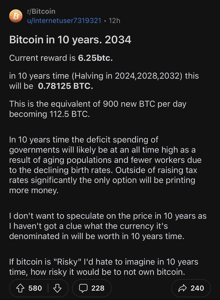 加密货币爱好者们继续在 Reddit 上重新发现一些最有趣的故事。广受关注的比特币主题账号“Trending 比特币”共享周日,一位匿名用户发表了一篇文章,强调不持有比特币的风险。