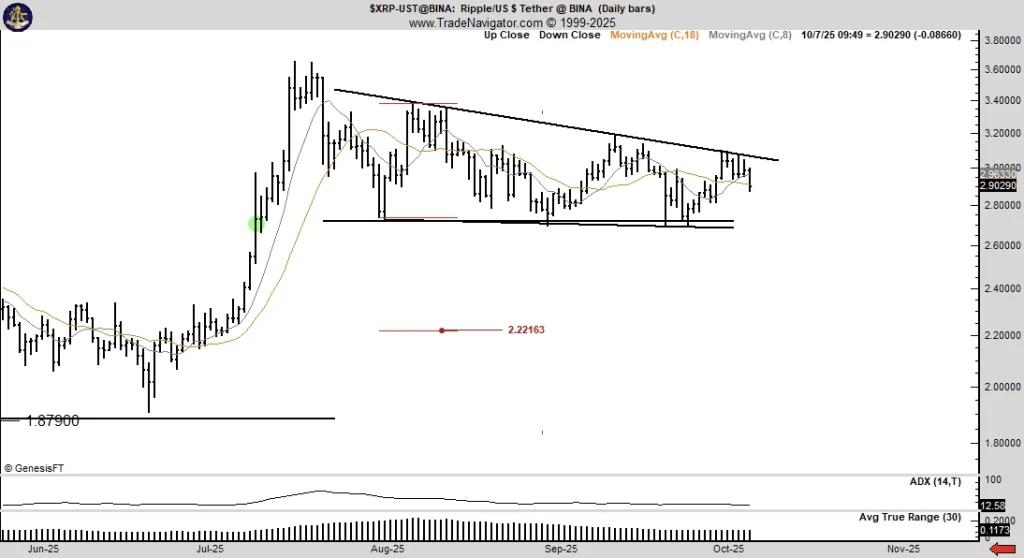 资深交易员 Peter Brandt 警告称,XRP 中期可能面临看跌前景。Brandt 指出,XRP 价格可能正在形成一个下降三角形,中期目标价位在 2.68 美元左右。
