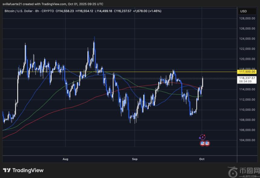 目前,比特币价格已接近116,200美元,较上周109,000美元附近的低点大幅反弹。8小时图表显示,新的看涨动能正在推动价格向117,500美元的关键阻力位靠近。自8月底以来,该水平多次限制了比特币的涨势,因此市场正密切关注是否会出现更广泛的突破。