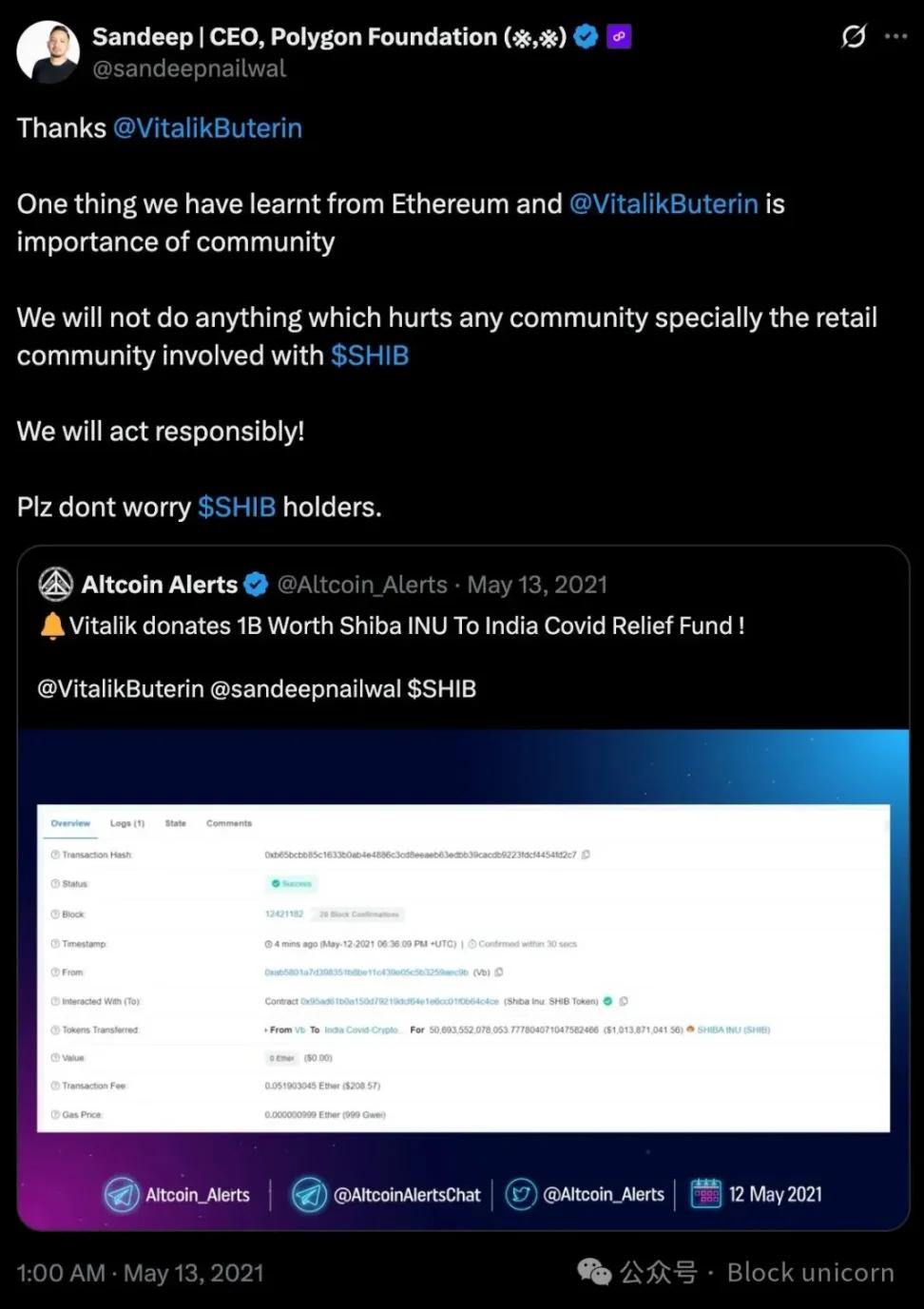 他在推特上表示无法对这场危机坐视不管。他创建了一个加密多重签名钱包用于接收捐款,预期总计可能募集 500 万美元。几天内,捐款就达到了 1000 万美元。随后,以太坊创始人维塔利克·布特林捐出了价值 10 亿美元的柴犬币。