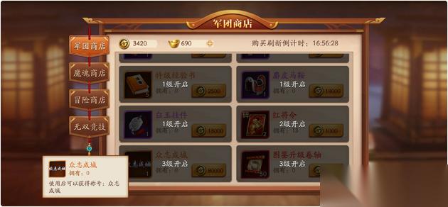 商城直购的"黄金帝王"自带5%全属性加成,军团商店的"统战先锋"需万人敬仰值兑换,精准投资才能收益最大化!