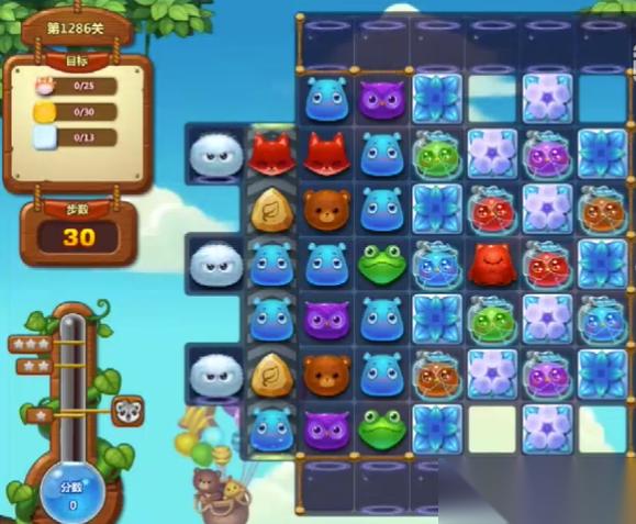 《开心消消乐》1286关通关攻略,1286关是消除气鼓鱼,蜂蜜和雪块的关卡,玩家需要在30步之内消除25个气鼓鱼,30个蜂蜜和13个雪块,难度指数四颗星。这一关的难点在于有锁链和毛毛球的阻碍。现在就让为你们介绍开心消消乐1286关三星攻略。