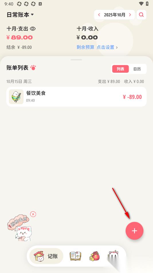 1.在手机上找到喵钱记账APP这款软件点击打开,然后在页面右下角的位置选择加号图标。