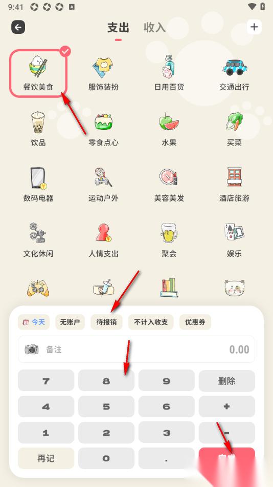 2.当我们进入到页面之后,在页面上选择需要的分类,然后点击【待报销】,再输入金额,点击完成按钮即可。