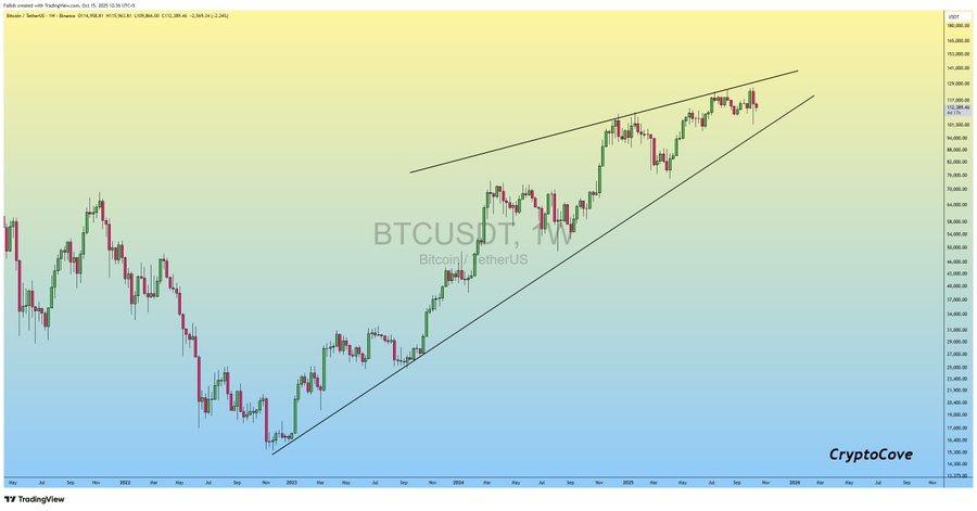从周线图来看,比特币目前处于上升楔形形态内,这种形态通常预示着潜在的反转。目前,多头仍占据主导地位,但动能正在减弱。