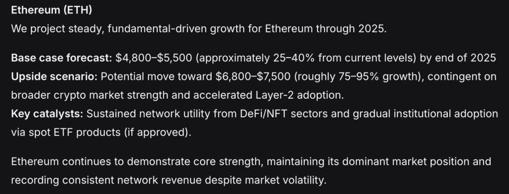 DeepSeek AI 认为,以太坊将在 2025 年之前保持稳定增长,其驱动力来自实际基本面而非炒作。该 AI 的基本预测是,到 2025 年底,以太坊的价格将在 4,800 美元至 5,500 美元之间,较目前价格上涨 25% 至 40%。