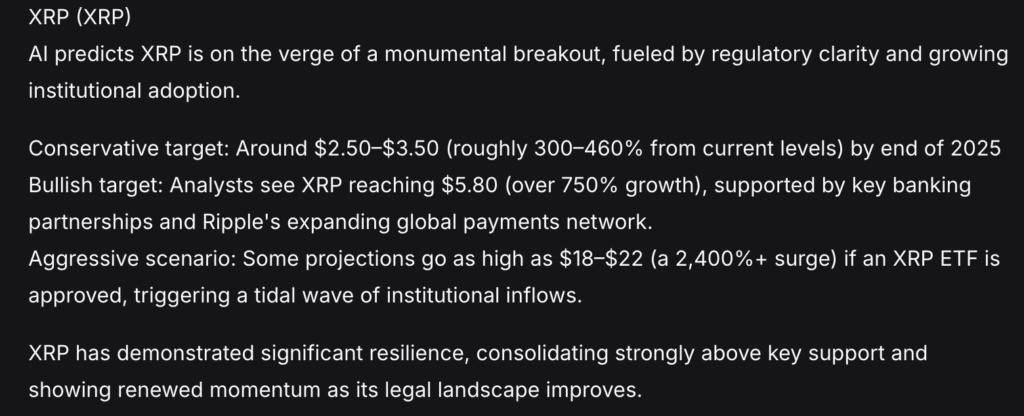 DeepSeek 列出了 2025 年底的三个可能的价格目标。保守估计 XRP 的价格将在 2.50 美元到 3.50 美元之间,这意味着将大幅上涨 300% 到 460%。乐观估计 XRP 的价格将在 5.80 美元左右,这得益于 Ripple 不断扩大的银行合作伙伴关系。最乐观的估计是 XRP 的价格将在 18 美元到 22 美元之间,但这可能需要 XRP ETF 和大量机构资金的流入。