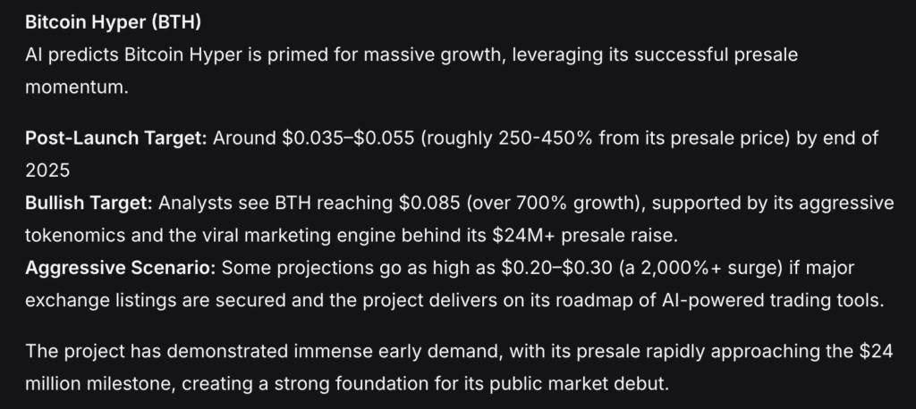 DeepSeek AI 认为,比特币 Hyper (HYPER) 可能会凭借其预售势头的强劲表现,迎来大幅上涨。该 AI 预测,到 2025 年底,BTH 的价格可能会跌至 0.035 美元至 0.055 美元之间,较预售价格大幅上涨 250% 至 450%。
