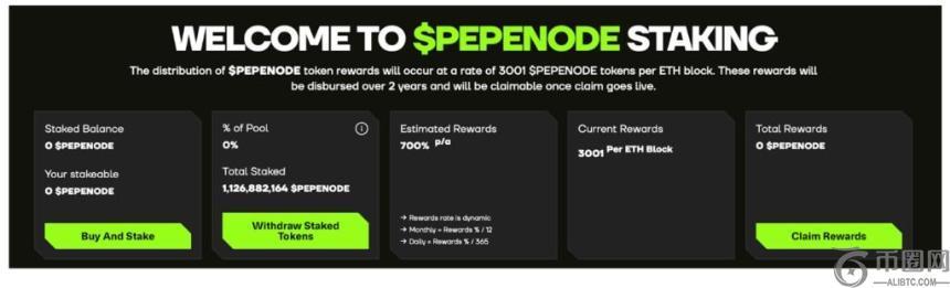 其次,它超越了游戏内实用性。PEPENODE 可以通过项目的原生质押协议进行质押,目前可获得 700% 的动态奖励。