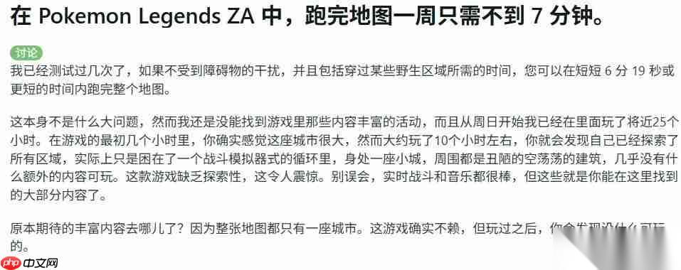 红迪上在宝可梦版块的发帖汇集了诸多提前获取游戏的不满之声。该帖子指出绕行密阿雷市外环一周仅需不到7分钟,最快记录甚至达到6分19秒——直指游戏地图规模过小的问题。