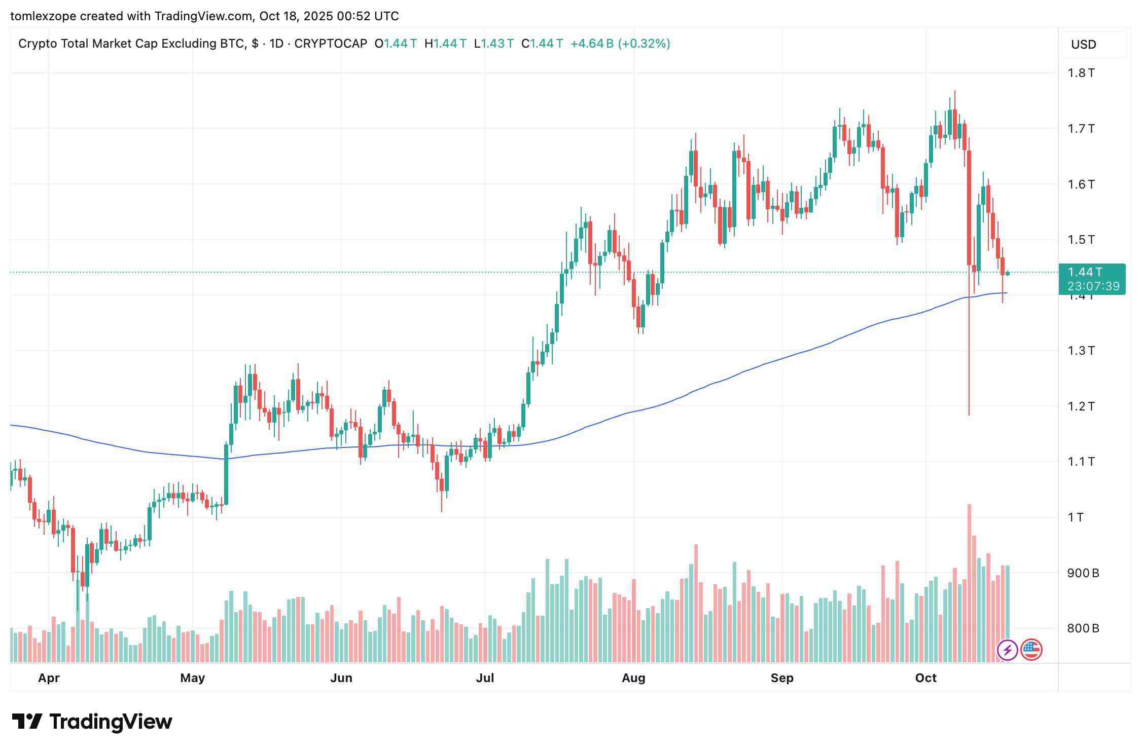 根据最新数据,加密货币市场(不包括比特币)市值约为1.45万亿美元,过去24小时内跌幅超过1%。更令人担忧的是过去一周的市场表现,在过去七天里损失了近13%的价值。