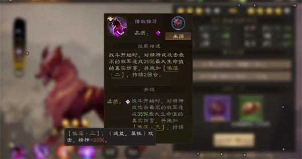 战斗开始时,对精神或攻击最高的敌军造成15%(最高35%)最大生命值的真实伤害,并施加低落持续2回合。低落:攻击精神-15%,最高20%。