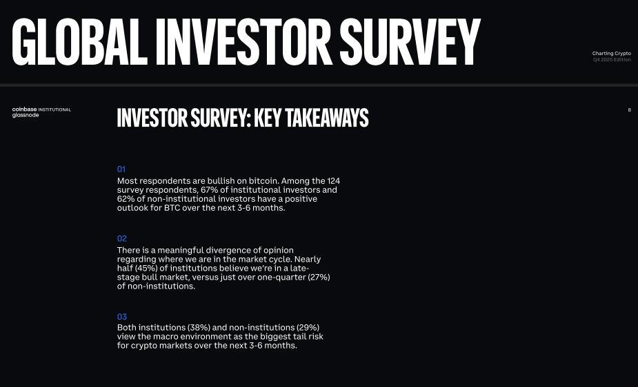 该调查对 124 位机构投资者进行了调查,发现 67% 的投资者对未来三到六个月的比特币持乐观态度。这意味着机构投资者尽管近期市场波动较大,但受访者仍然对加密货币抱有信心。Coinbase 研究主管 David Duong 指出,“大多数受访者都看好比特币”,尽管对于市场目前所处的周期阶段,人们的看法截然不同。