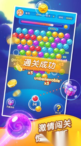 本游戏采用发射泡泡方式消除和得分,玩家只需把炮口瞄准空中的彩色泡泡,形成三个或以上就可以逐渐通关。游戏有着十分清爽的场景和欢快音乐,无论上班摸鱼还是休闲时都能随时体验,随着关卡上升,也会有更快的速度和多种障碍。玩家在遇到难度挑战时,可以利用爆炸道具进行屏幕清理,超炫的效果拥有无限沉浸感。