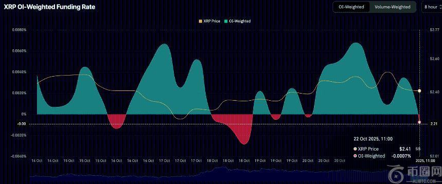 截至撰写本文时,OI 加权融资利率已从周二的 0.0035% 大幅下降至 -0.0007%,表明更多交易员正在建立空头头寸,反映出对 XRP 的负面情绪。