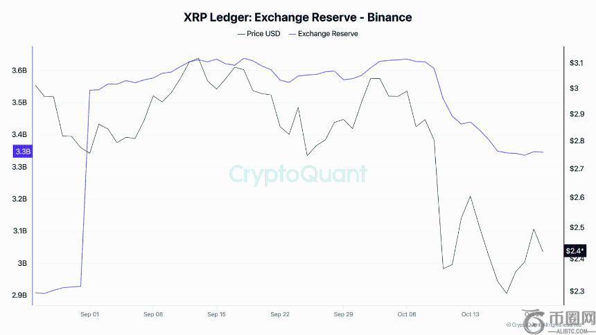 另一方面,币安交易所的 XRP 储备自 10 月 1 日以来已下降 3.36%,平均减少 34.5 亿枚。这一持续下降表明部分投资者对 XRP 短期至中期的价格回升持乐观态度。