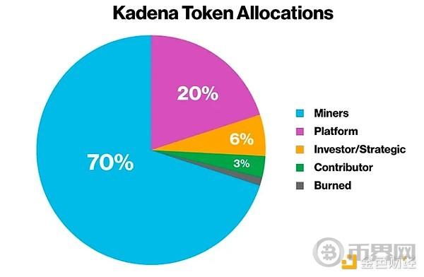 KDA 是 Kadena 区块链的原生加密货币,用于支付交易费用、激励矿工以及参与平台治理。KDA 代币的初始分配为:70% 给矿工、20% 用于平台储备、 6% 给开发者、3% 给贡献者、1% 销毁。