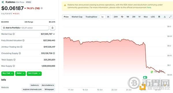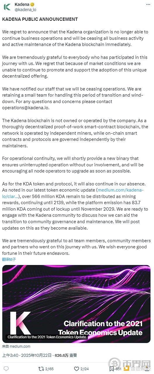2025年10月22日,Kadena 团队宣布,由于市场环境不利,将即刻停止所有业务运营和活跃维护。团队对所有支持者表达感谢,并表示遗憾无法继续推广这一独特的去中心化项目。Kadena 原生代币 KDA 当日跌超60%。