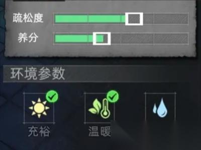 这里放「泥土」是因为它的疏松度和营养进度条是一致的方便调节,而且不算低在 20% 左右,这里就不放图了,大家自己游戏里看。
