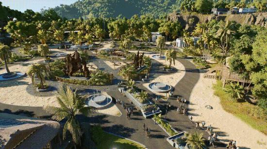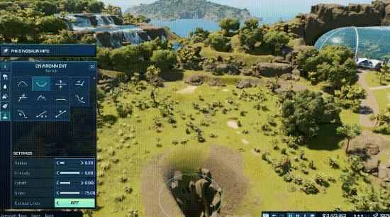 建造出坡道连接园区里更高的地区,以便游客前往这些区域,然后使用环境工具准备和塑造地形,使其符合恐龙的需求,或与园区美学风格相匹配。