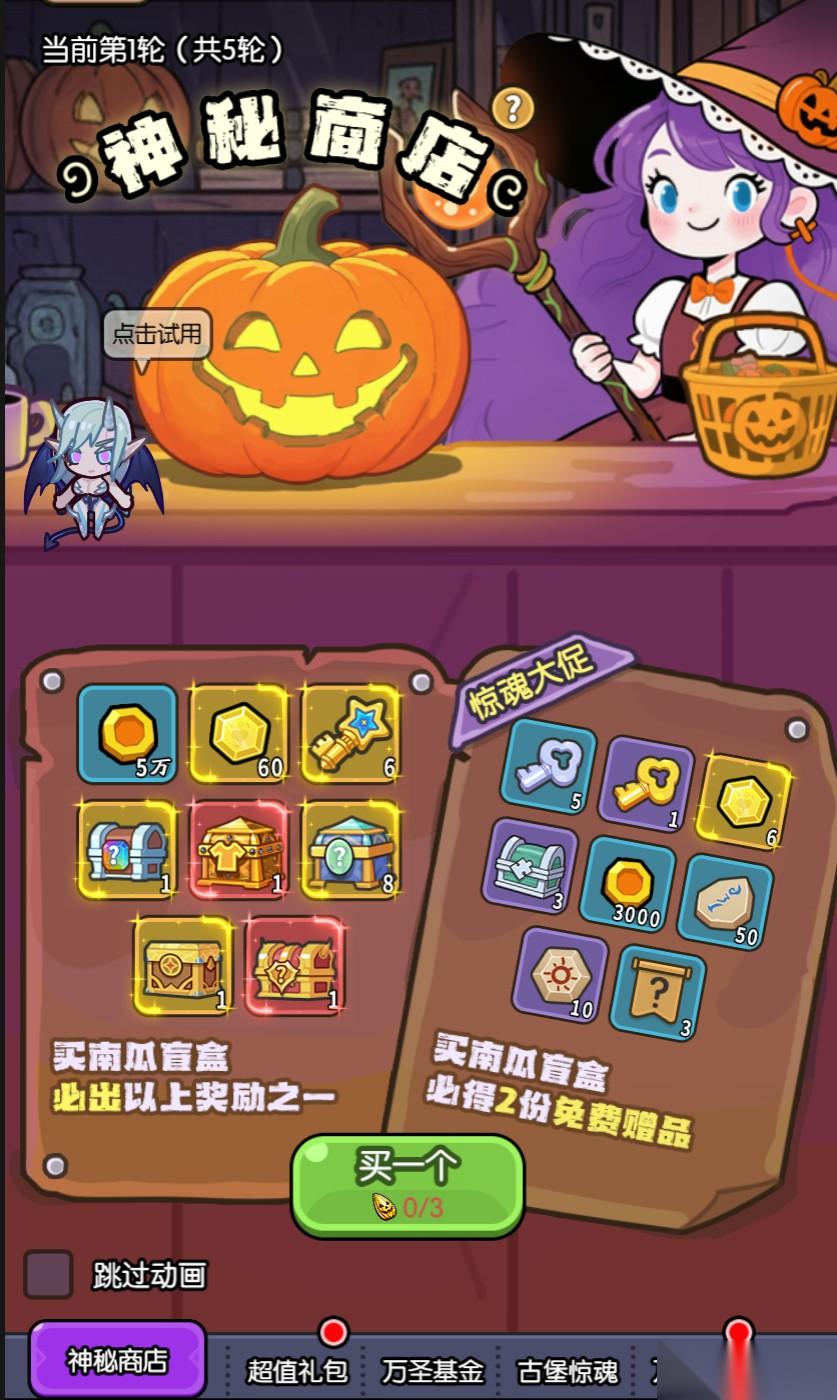 ②神秘商店正在进行限时大促销:每个南瓜盲盒都有一份不重复的惊喜大奖;买南瓜盲盒还会随机获赠2份赠品;