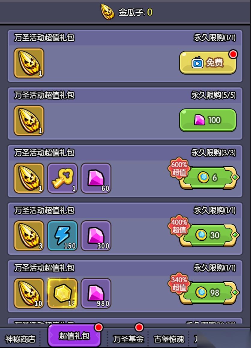 ①万圣节活动期间,限时开启“神秘商店”用“金瓜子”可与小魔女交易“南瓜盲盒”盲盒会开出柜台海报上的奖励;可在“超值礼包”及“星辉祈福”处获取“金瓜子”。