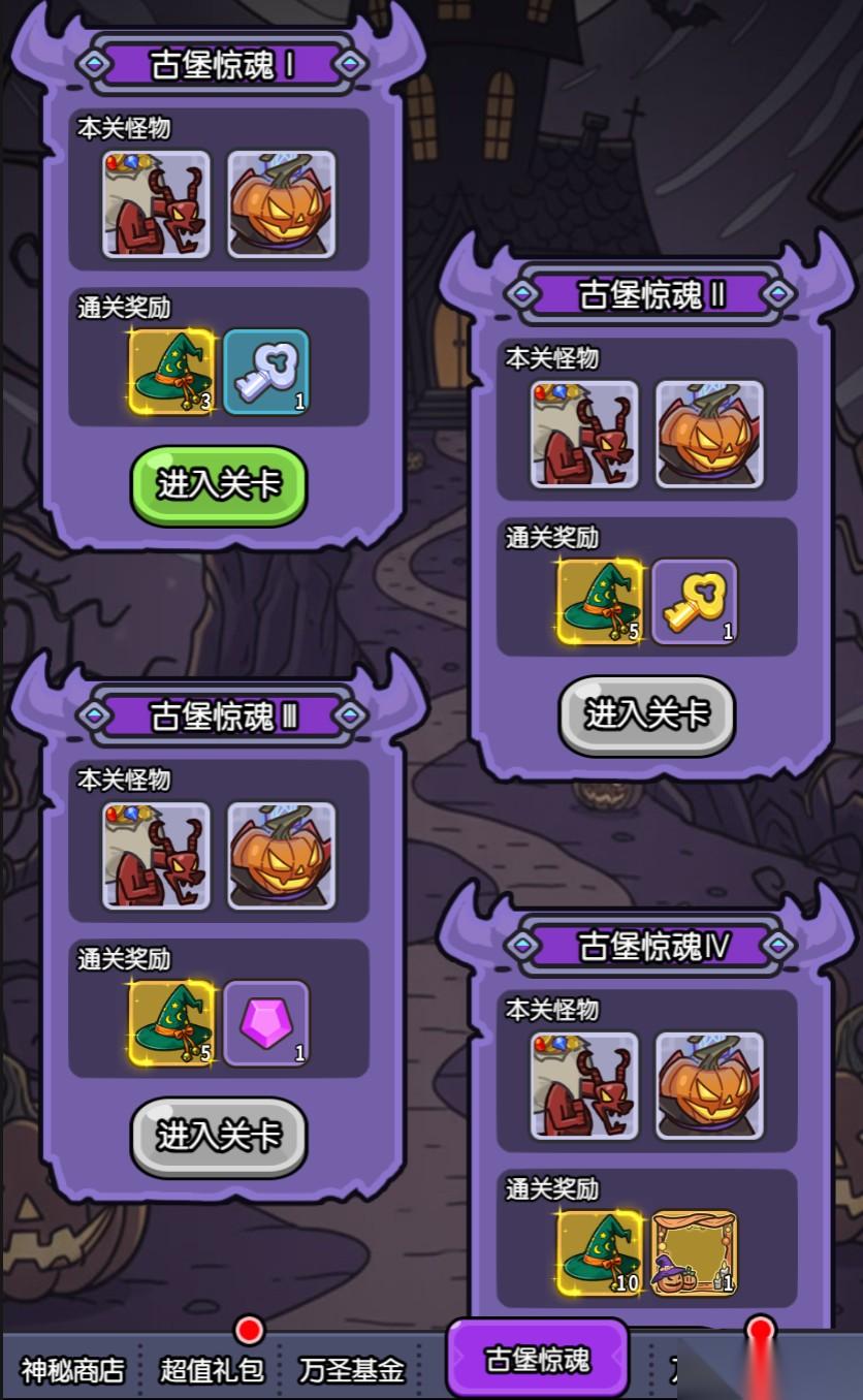 活动期间,开启限时活动关卡·古堡惊魂:击败盗取糖果的迅猛盗贼与恐怖的南瓜怪物,即可获得对应的关卡奖励!全部通关还可获得万圣节限定头像框【秩序守护者】!