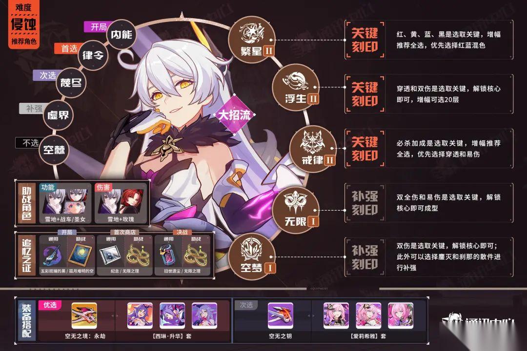 鏖灭在配合浮生的情况下效果非常好,容错与伤害兼顾。由于大招动画过长,因此大招流无需解锁刹那核心,只需要在商店中购买散件即可。