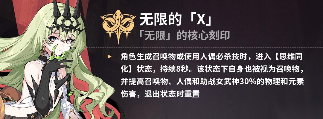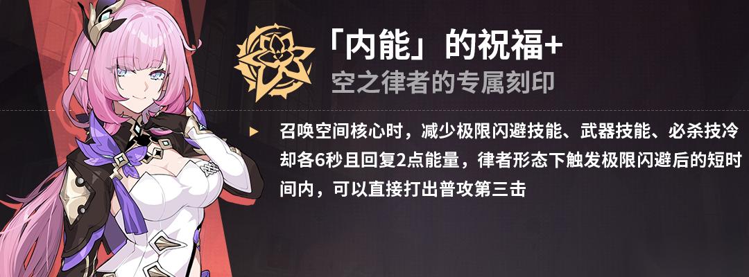 【内能】是女王的核心循环刻印。虽然是没有任何加成的纯循环刻印,但仅仅是依靠循环就能让女王在短时间内生成大量空间核心,除了用来叠加大招伤害以外还能造成相当可观的输出。