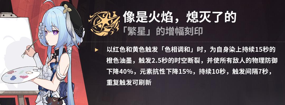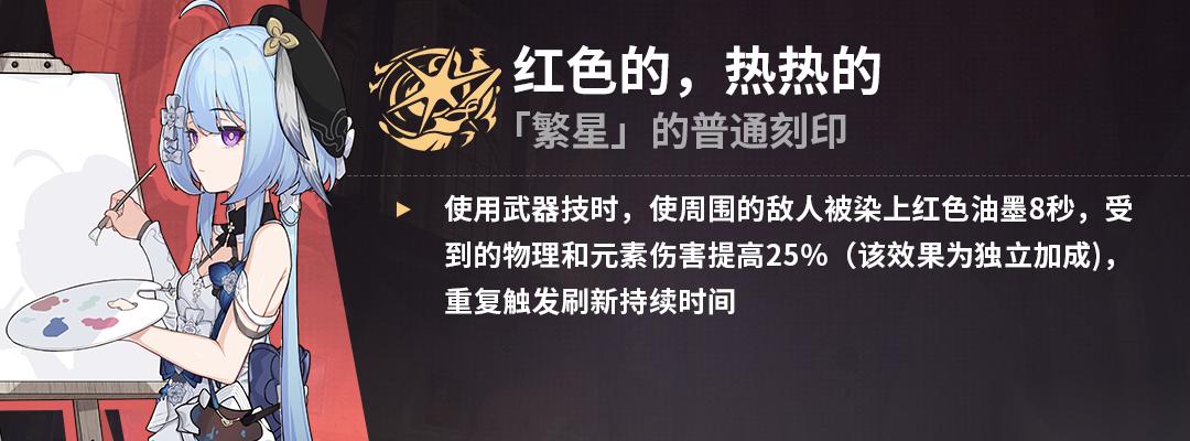 繁星Ⅱ各种颜料的效果都非常契合女王,适合作为优质过渡刻印使用。其中红黄混色的减抗效果可以和双星以及圣女的脆弱进行搭配,从而使敌人直接进入100%脆弱的状态,省去了选择其他穿透刻印的步骤。如果不选择这个思路的话可以走百穿路线,可以达到相同的效果。