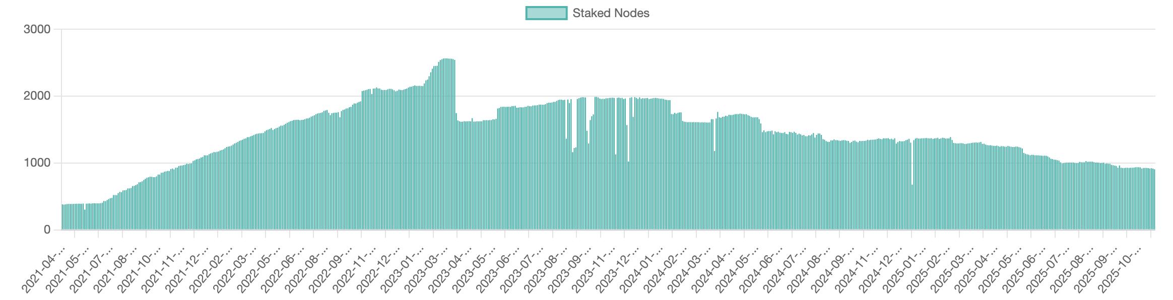 尽管有这些优势,Solana 的验证者数量却在稳步下降。在 2023 年初达到约 2,560 个节点的峰值后,目前活跃的节点数量仅为906,仅 2025 年就将下降 33%。