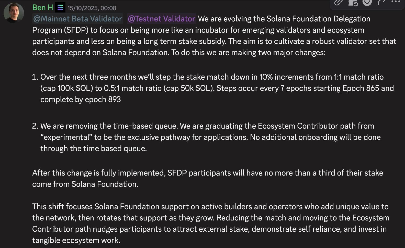 导致验证者数量下降的另一个因素是 Solana 基金会取消了对验证者的补贴。为了在网络初期启动广泛的验证者运行,Solana 基金会委托计划 (SFDP) 承担了较新和较小节点的成本,并帮助增强了新兴运营商的权益。