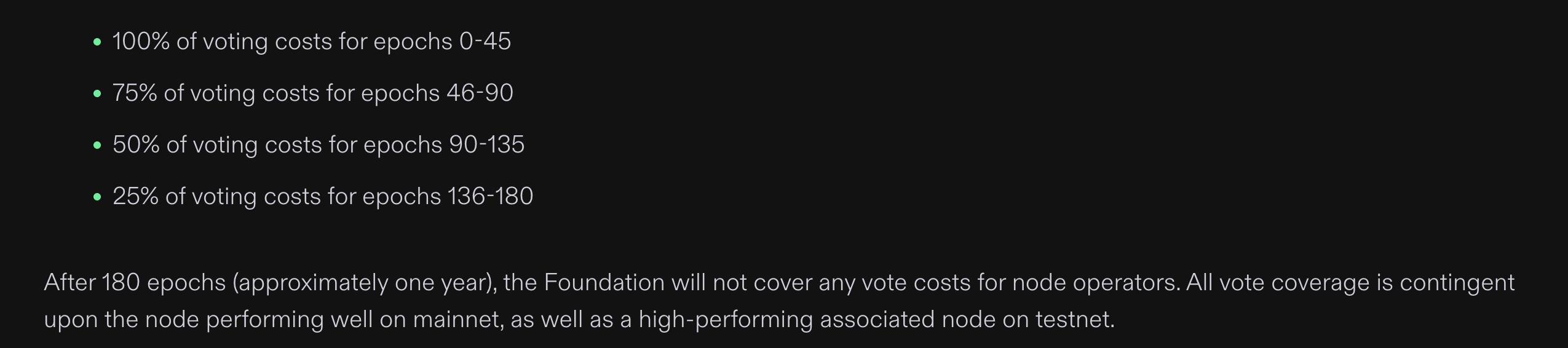 除了对持有少于 100,000 $SOL 的合格验证者进行 1:1 的权益匹配外,SFDP基金会还协助新验证者承担投票成本。从全覆盖开始,基金会为年轻验证者在其生命周期的前 180 个 epoch 期间提供帮助。