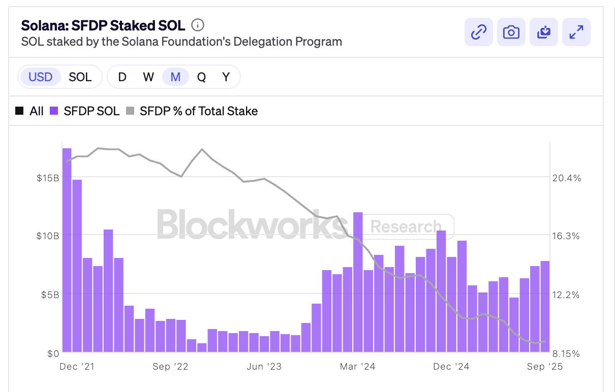 Blockworks 数据数据显示,SFDP 的持股比例已从 2022 年 12 月的 22.26% 降至如今的 8.95%。然而,尽管 SFDP 的持股比例较小,但基金会的数据显示54%所有 Solana 验证者都通过 SFDP 获得支持。