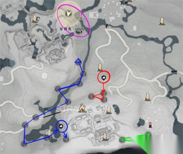 抵达后注意方向,需向后折返沿通道采集,前方为大殿区域,不建议误入。该路线适合利用传送功能快速收集。